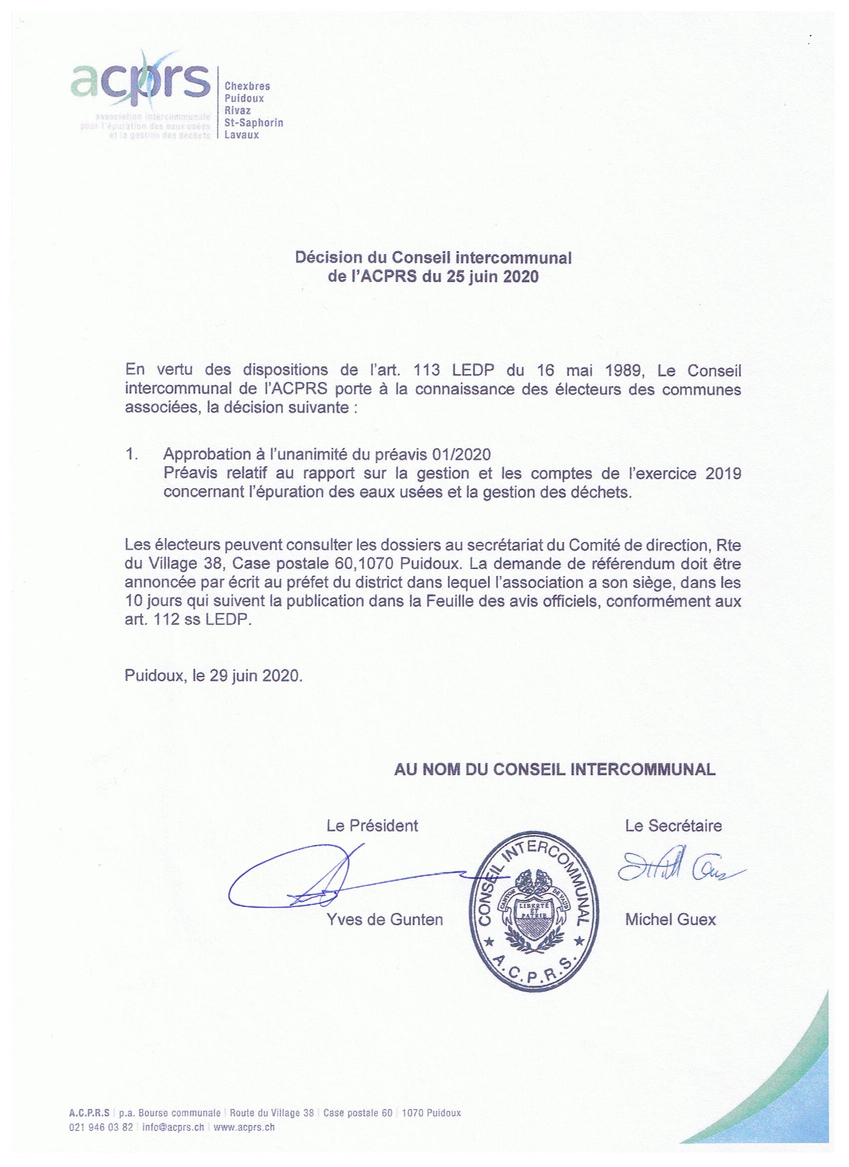 Actualité du 29.03.2021En vertu des dispositions de l’art. 113 LEDP du 16 mai 1989, Le Conseil intercommunal de l’ACPRS porte à la connaissance des électeurs des Communes associées, la décision suivante :